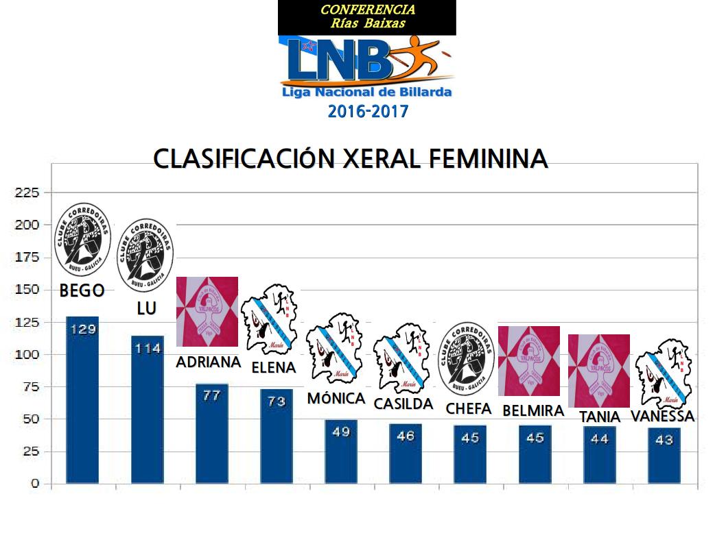 Na categoría feminina, Bego, que colleu o liderado a xornada anterior, parece decidida a non deixalo ata o final, posto que nas dúas últimas xornadas fixo unha media de 24 ptos, ou sexa que está en números de liderado Absoluto. Lu mantén a súa media de 14 ptos e espera algún fallo da súa compañeira de equipo. As demais competidoras están a moita distancia destas dúas e deberán buscar outros obxectivos que non sexan o título de Conferencia. Así, Elena segue recortando a distancia que a separa da terceira praza do podio e xa está a 4 ptos de Adriana, a palanadora de Vigo en idade infantil que lle poñerá as cousas difíciles á da Adina. Por detrás, Mónica consolidou a quinta praza. Esta loita suponse extraordinaria ata o final, pois do quinto posto ao décimo hai 6 puntos de distancia. O que podemos dicir da categoría feminina é que tres equipos son os que monopolizan o TOP DEZ, Corredoiras, Valpaços Terra Quente e Gharaboto.