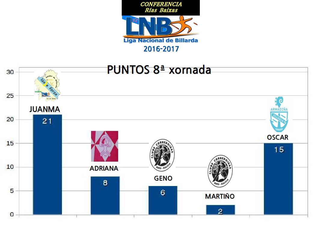 Na xeral absoluta, Xan cunha media de 24 ptos de media por xornada non dou opción a que ninguén ocupara a primeira praza. Só Ricar se mantén a unha distancia que lle permite ter esperanzas de disputarlle o título 2017. O de Bueu fixo nestas 8 xornadas 21 ptos de media. Despois, cunha media de 19 ptos por xornada están Che e Salva que son as alternativas para cando os dous primeiros fallen. Fari, cunha media de 18 ptos por xornada, podería sumarse a estes dous xogadores e formar o trío que se mantén ao axexo, o que sucede é que o de Bueu faltou unha xornada e iso vaino condicionar o resto do campionato. O resto dos competidores e competidoras que forman o TOP DEZ rondan os 15 ptos de media por xornada.