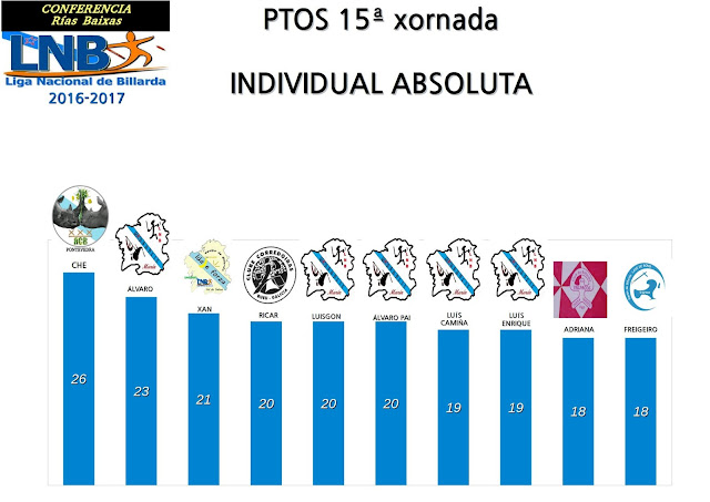 Che estivo magnífico toda a tarde. Sabemos que ten golpes nefastos, de non golpear a billarda, pero o que non ten ninguén máis da Conferencia, e atreveriámonos a dicir de toda a LNB, é ese golpe supersónico que lle permitiu conseguir o Título Nacional de Varados, e co que onte fixo o único varado da xornada, estando nunha situación límite de eliminación. Álvaro tivo unha actuación boisima, igual que Luís Gon, Álvaro Pai, Luís Camiña, Luís Enrique, Freigeiro e Adriana. Os dous candidatos ao Título 2017, Xan e Ricar, estiveron moi parellos. As súas puntuacións foron as normais para dous palanadores que promedian 23 e 22 puntos por xornada, respectivamente.