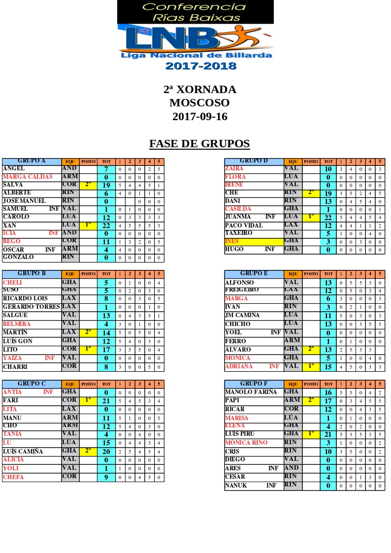 A xornada foi ganada por LÚA DE FORZA, que deste xeito entra en praza de Play Off. A igualdade de forzas que se preveía esta temporada quedou demostrado na xornada de Moscoso. Deste xeito, aos dous grandes, CORREDOIRAS e GHARABOTO, separáronos dous puntos, e o equipo de Sanxenxo, coas novas incorporacións xa en pleno rendemento, superou a eses dous equipos en 1 e 3 ptos, respectivamente.
