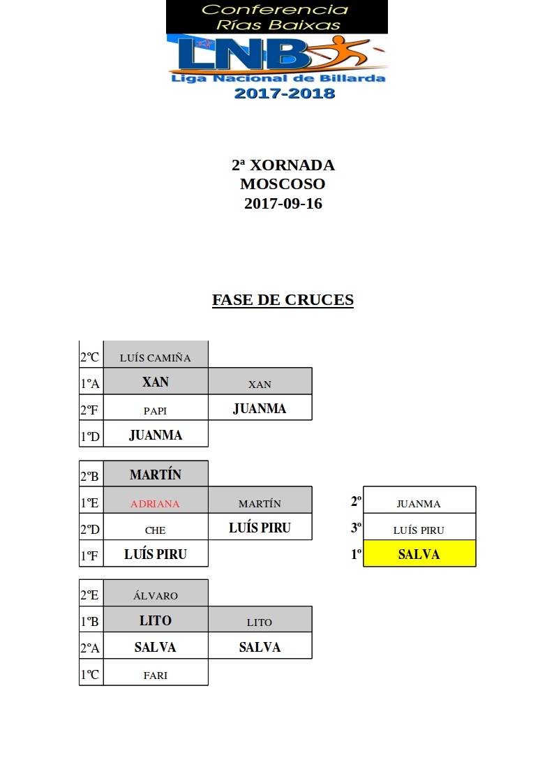 O gran triunfador da xornada foi SALVA, que rematou a xornada cun extratosférico varado (campo olímpico de 50 m x 20 m). Mais tivo que ser no desempate da final contra Juanma, o palanador en idade infantil que estivo a piques de facerse coa súa segunda vitoria absoluta en xornada de liga. O de Lúa de Forza sitúase na segunda praza da xeral, a tan só un punto do líder. Outro que está de volta da longa travesía do deserto é o Piru. O billardeiro da Torre recupera o seu xogo e as súas posibilidades de estar loitando de novo por estar entre os grandes da categoría. Quedou en terceira posición e prometeu buscar, este ano si, algún título de regularidade na súa Conferencia xenealóxica.