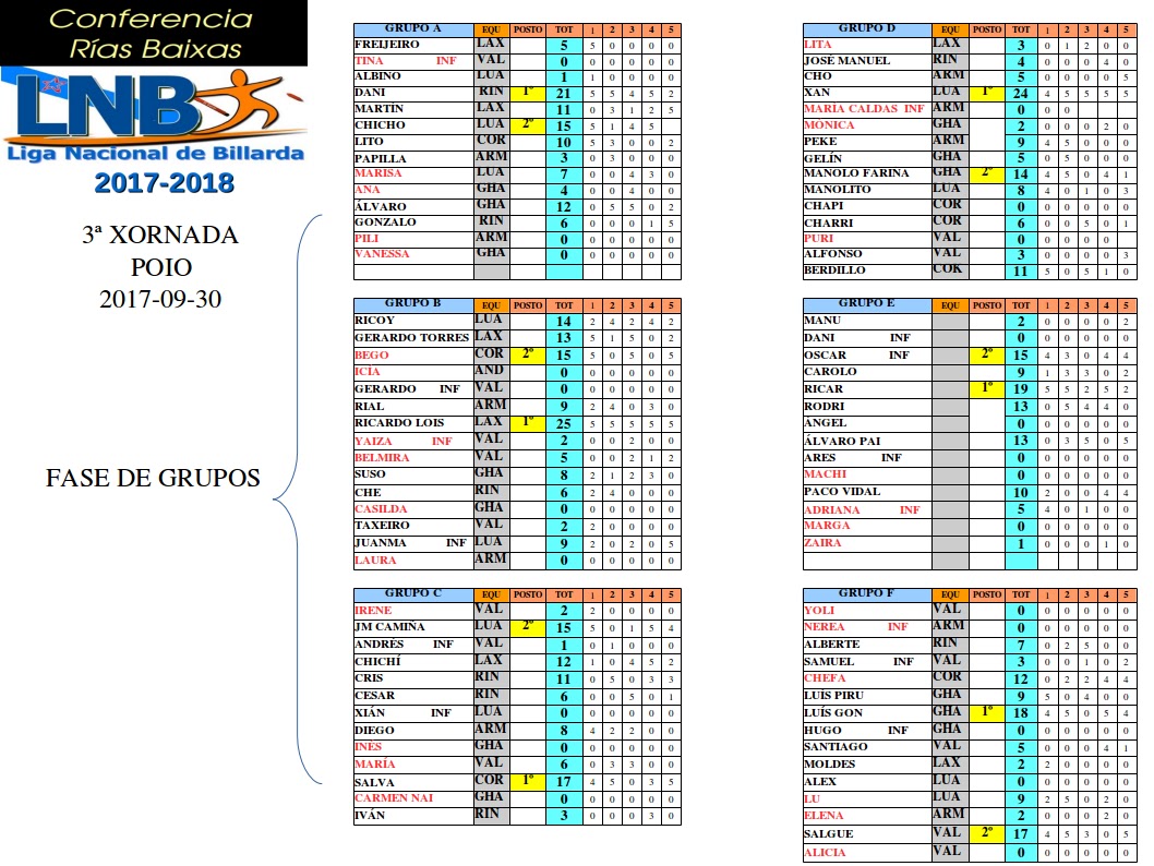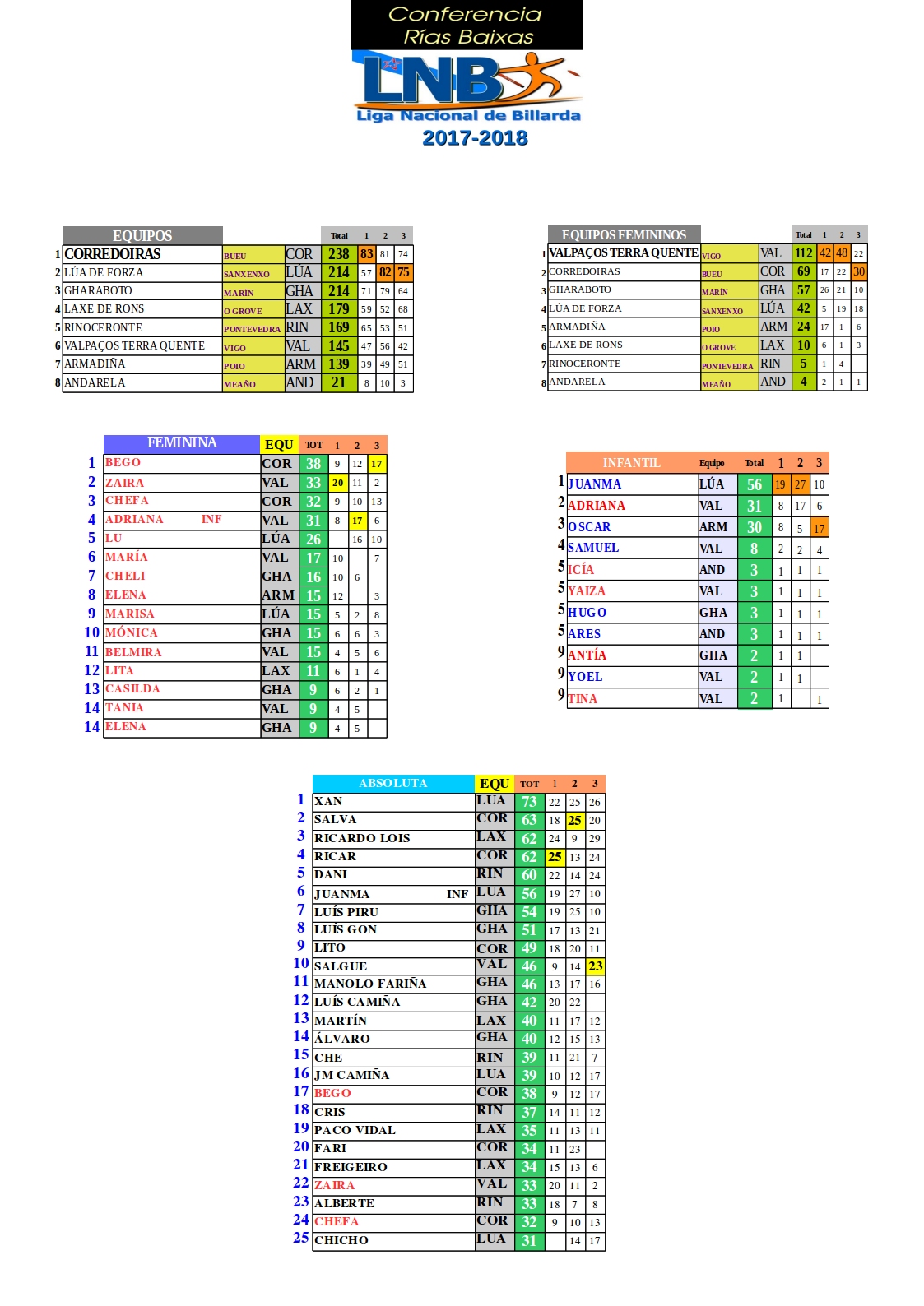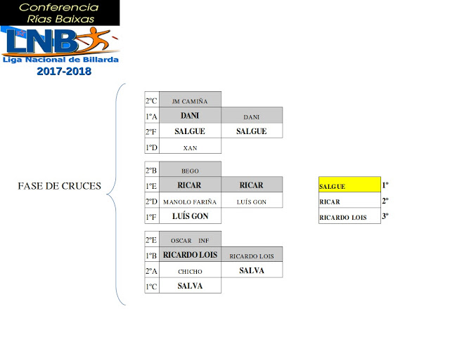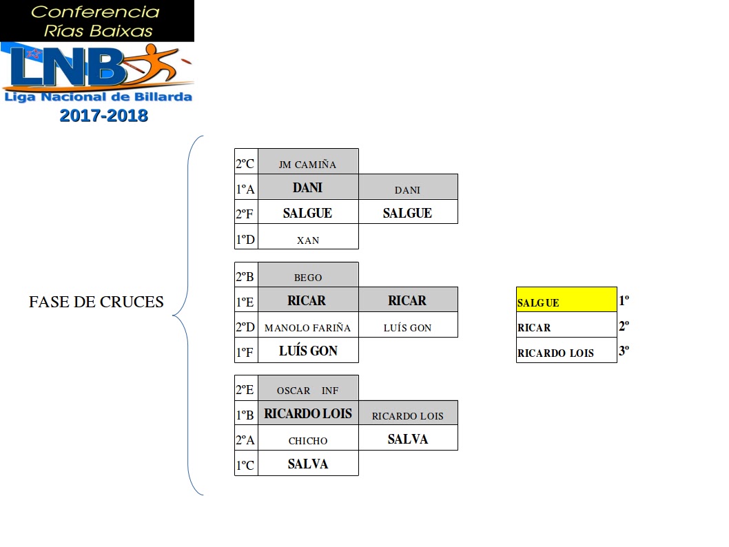 Salgue foi o gran triunfador da xornada. O xogador de VALPAÇOS TERRA QUENTE (Vigo) inscribiu, por vez primeira, o seu nome no Ranking LNB como vencedor dunha xornada na Conferencia Rías Baixas. Despois dunha fase de grupos na que se clasificou en segunda posición foi eliminando a quen se lle puxo diante, ata ganar cun golpe precioso que atravesou o varal azul e branco do BILLARDA ESTADIO. Bego ganou na Categoría Feminina e Oscar do equipo local Armadiña confirmou a súa recuperación despois da lesión e fixo máis puntos que ninguén na categoría Infantil. Na Categoría de Equipos ganou o equipo de Sanxenxo, LÚA DE FORZA.