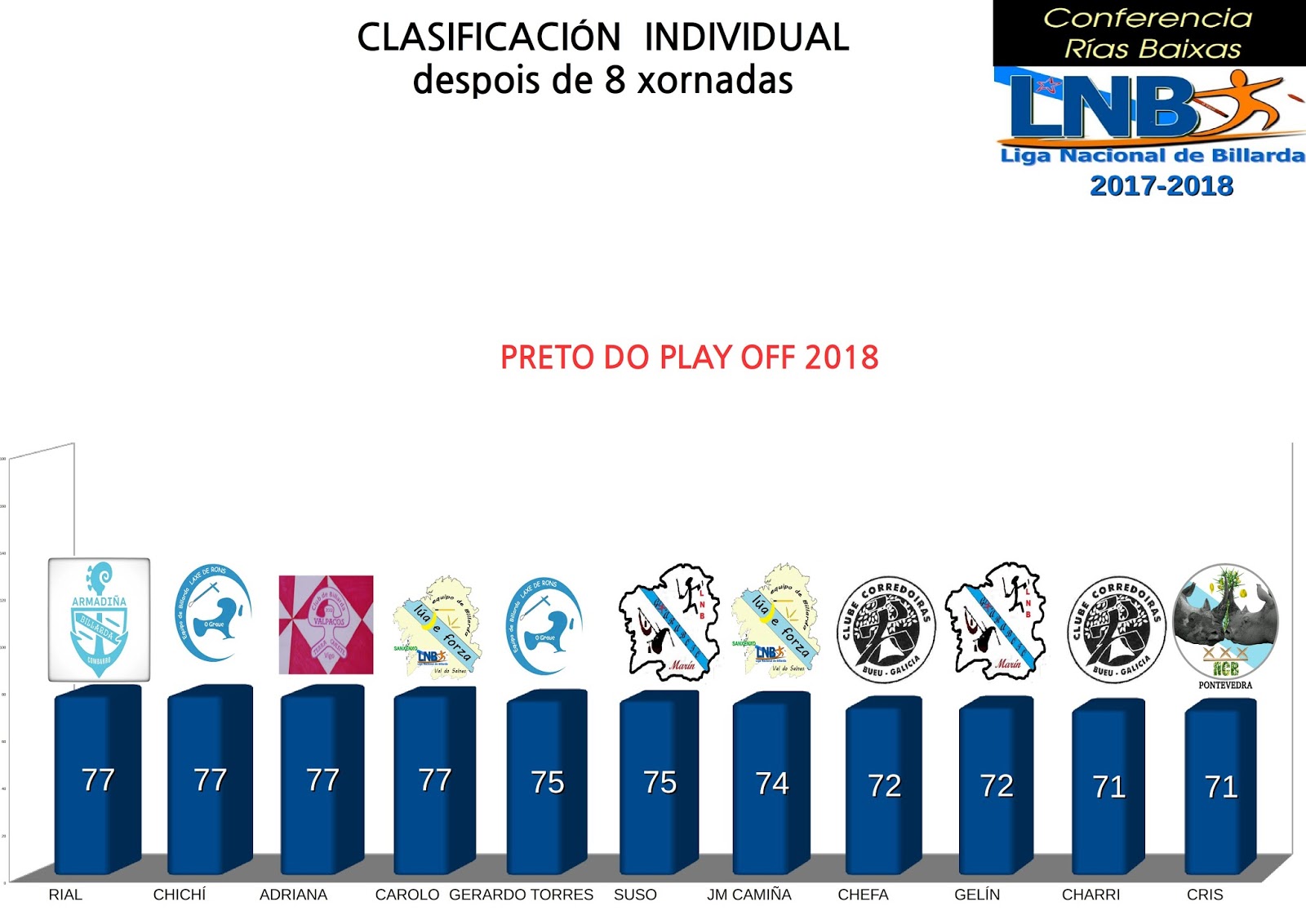 xeral. Estas dúas prazas de podio que deixará a de Bueu hai varias candidatas de prestixio e currículo. Lu está alcanzando o nivel que a levou a ser a conseguir dous títulos Nancionais, a única da Conferencia. Adriana, Chefa (actual Campiona Nacional) e Elena (1 campionato de Conferencia) serán as outras candidatas a estas prazas. Por detrás destas 5 palanadoras veñen prometedoras xogadoras como Elena Sabarís, Zaira, Yaiza e Mónica. Que teñen unhas posicións cómodas de Play Off, mais non poden descoidarse. Marisa, Belmira e Marga están en lugares de risco. Preséntase moi apaixoante esta época de inverno na LNB Rías Baixas.
