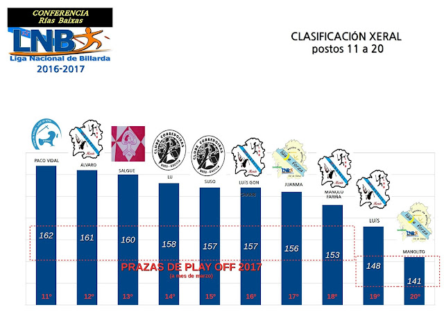 As previsións meteorolóxicas durante a semana previa indicaban a tendencia de tempo chuvioso, mais o sábado as nubes que sobrevoaron Mourente non se atreveron a deixar caer auga sobre o terreo terruño-herboso do campo de billarda. Daquela, todo parecía prever que o equipo RINOCERONTE tería unha boa ocasión para acceder á terceira posición do podio. Hai veces que a nosa imaxinación non é quen de deseñar o futuro. Deste xeito, o equipo de Pontevedra levou un batacazo importante, xa que só conseguiu 40 puntos. Ademais, coincidiu coa boa actuación dos equipos que están diante na clasificación. Tanto GHARABOTO como LÚA DE FORZA, superaron os 70 puntos e xa se distancian demasiado, quizáis. Os outros equipos estiveron nos seus números. CORREDOIRAS dominou de novo a xornada. O equipo de Bueu non ten outro obxectivo que chegar no mellor momento de forma ao PLAY OFF 2017 para conseguir un título que se lle escapou o ano pasado por un punto.