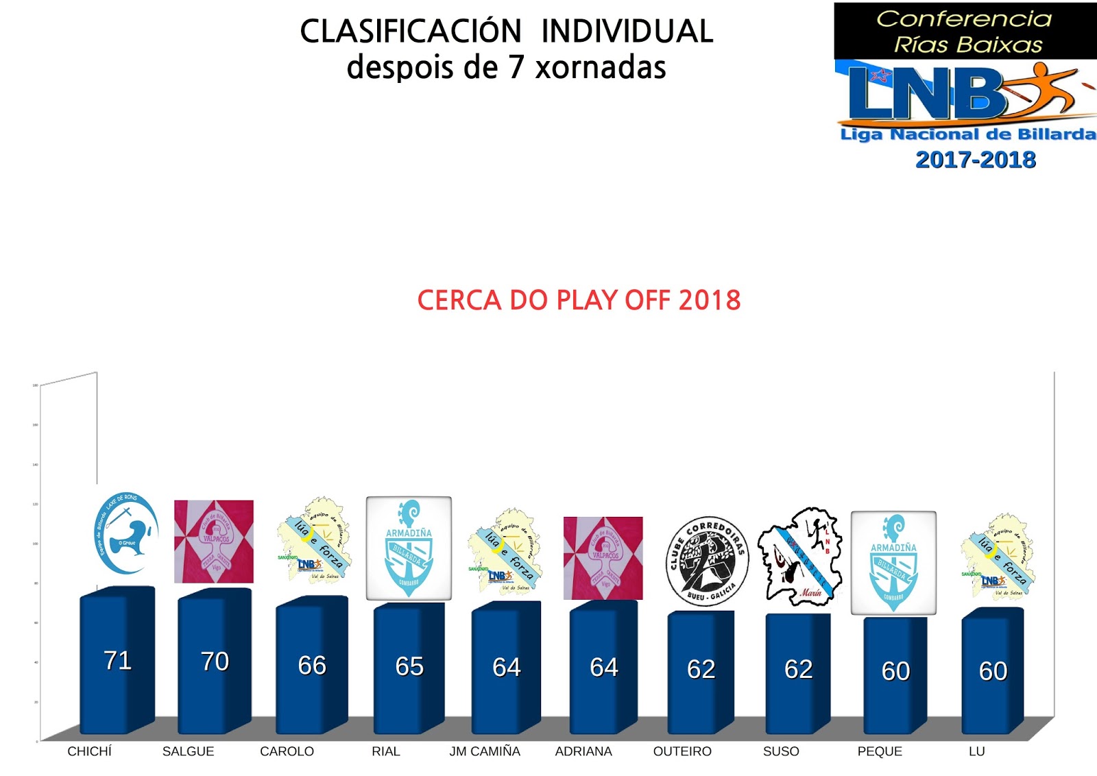 As prazas que darán dereito a participar no Play Off 2018, que a día de hoxe serían 22, continúan a incluír na lea a unha ducia de palanador@s. Aquí si que haberá tomate! Carolo, Adriana, Outeiro, Suso e Lu están, de momento, fóra desas prazas e son xogador@s que outros anos conseguiron praza, polo tanto, non van deixar de loitar ata a última carreira. Alberte, Cho e Manu nunca conseguiron praza e actualmente téñena, entón, estes tamén van dar o seu alento para que ninguén lles tire o seu soño de disputar a tan cobizosa Coroza Nacional 2018.