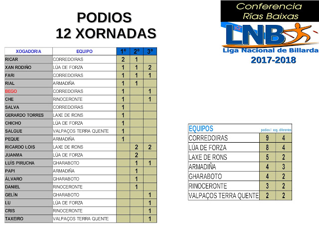 Xogadas xa 12 xornadas e a falta de 6 para o final de liga podemos analizar se o éxito deportivo na billarda é privilexio de poucas persoas, ou por formulalo doutro xeito, hai grandes dominadores/as neste deporte tradicional como o hai noutros deportes? Os números están ben claros e a valoración deles é cousa de cada quen. Ao noso entender cremos que se en 12 xornadas houbo 11 ganadores /as diferentes e de 21 persoas que subiron ao podio, e só 8 repetiron algunha vez a ceremonia protocolaria, a democratización nos resultados é evidente. Outra cousa é a regularidade que esixe unha liga de 18 xornadas. Aquí, si que hai un grupo reducido de xogador@s que están por enriba dos 17 puntos de media por xornada e que loitan polo podio final. Este ano o grupo é de 5 xogadores e 1 xogadora.