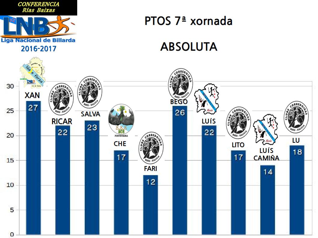 Na categoría absoluta, Salva de Corredoiras fíxose coa xornada por diante de Cho de Armadiña e Xan de Lúa de Forza. Seis palanadores conseguiron 20 puntos ou máis. Xan mantense firme na primeira posición e Ricar, Salva e Che parecen os únicos que lle manteñen o ritmo, aínda que a máis de 30 puntos de distancia. A vitoria na xornada de Salva axudoulle a situarse no terceira posición do podio da Conferencia superando a Che. Entran de novo no TOP DEZ, Bego, Luís e Lu e saen del Luís Rino, Luís Gon e Suso. Salientar a formidable actuación de Cho, que conseguíu a segunda posición da xornada. A pesar de ser un novato xa subiu ao poido. Ten un enorme potencial agora veremos se é quen de refrendalo coas seguintes puntuacións. Outras puntuacións destacadas foron a de Beni de Gharaboto (18 puntos) e a de Albino Caneda de Lúa de Forza (19 puntos), dous xogadores da parte media da clasificación, pero que tiveron un rendemento sobresaínte.