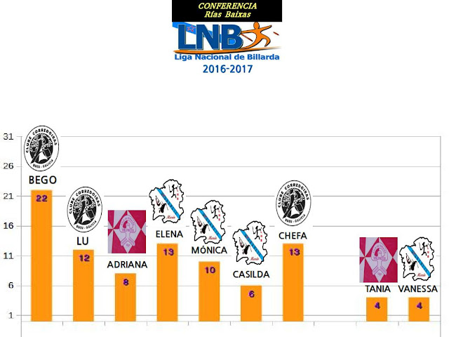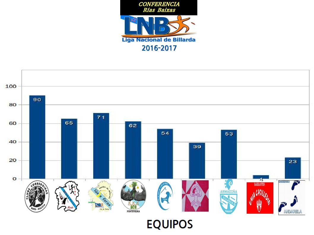 82 ptos de media por xornada que consegue Corredoiras só están ao alcance de Billardeiros Musicais, actuais Campións 2016 da LNB, que compiten na Conferencia Norleste. Facendo a comparativa e considerando que os sistemas de puntuación son moi similares, estes dous equipos volven ser os dous grandes favoritos para o Título LNB 2017. O ano pasado un só punto separou ao equipo de Ribadeo do de Bueu. Este ano non vemos que outro equipo poida estar ao seu nivel, aínda que pola cancela que se abre en xaneiro para fichar palanadores e palanadoras poderían entrar reforzos que subisen o nivel dalgún outro equipo. Quen sabe?