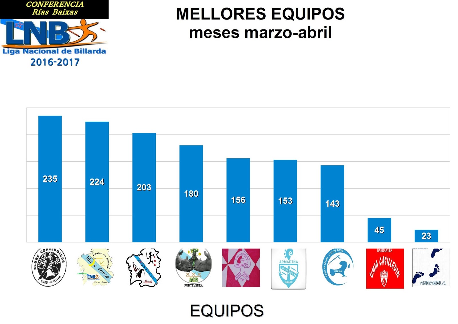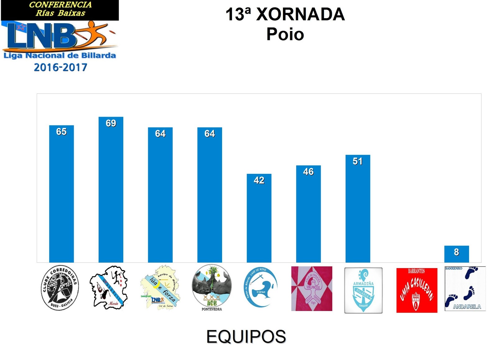 Despois de sumar os puntos desta 13 xornada, a clasificación de equipos non sofre modificacións de transcendencia. Deste xeito, CORREDOIRAS, sen ganar a xornada, segue 190 puntos por diante do segundo clasificado, o que nos fai pensar que na seguinte xornada poden conseguir o título de xeito matemático. As prazas de podio e que dan dereito ao PLAY OFF 2017 mantéñense como estaban. Faltan 3 xornadas e a distancia de 71 puntos entre GHARABOTO e RINOCERONTE indica que, practicamente, o equipo de Marín ten asegurada a praza de PLAY OFF, mentres o equipo de Pontevedra deberá seguir competindo con LÚA DE FORZA para ver quen dos dous nos representa este ano nas finais de Compostela. O equipo de Sanxenxo continúa por diante do de Pontevedra e cunha distancia de 40 puntos.