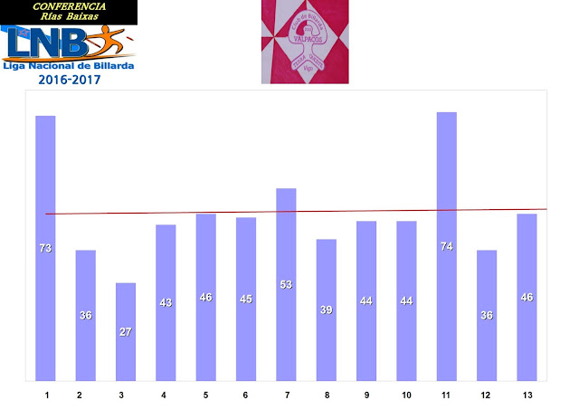 Outros datos relevantes son os da tendencia dos equipos. Abaixo vemos como dos 4 primeiros as tendencias ascendentes son de GHARABOTO e de RINOCERONTE. CORREDOIRAS e LÚA DE FORZA marcan un lixeiro descenso na súa tendencia. Isto significa que o equipo de Bueu e de Sanxenxo empezaron a temporada moi fortes e non son quen de manter o nivel, ben certo que CORREDOIRAS obtivo tanta vantaxe de puntos que non lle vai influir esta tendencia. A quen si pode afectarlle é a LÚA DE FORZA. Veremos se lle chega coa vantaxe que ten sobre RINOCERONTE.
