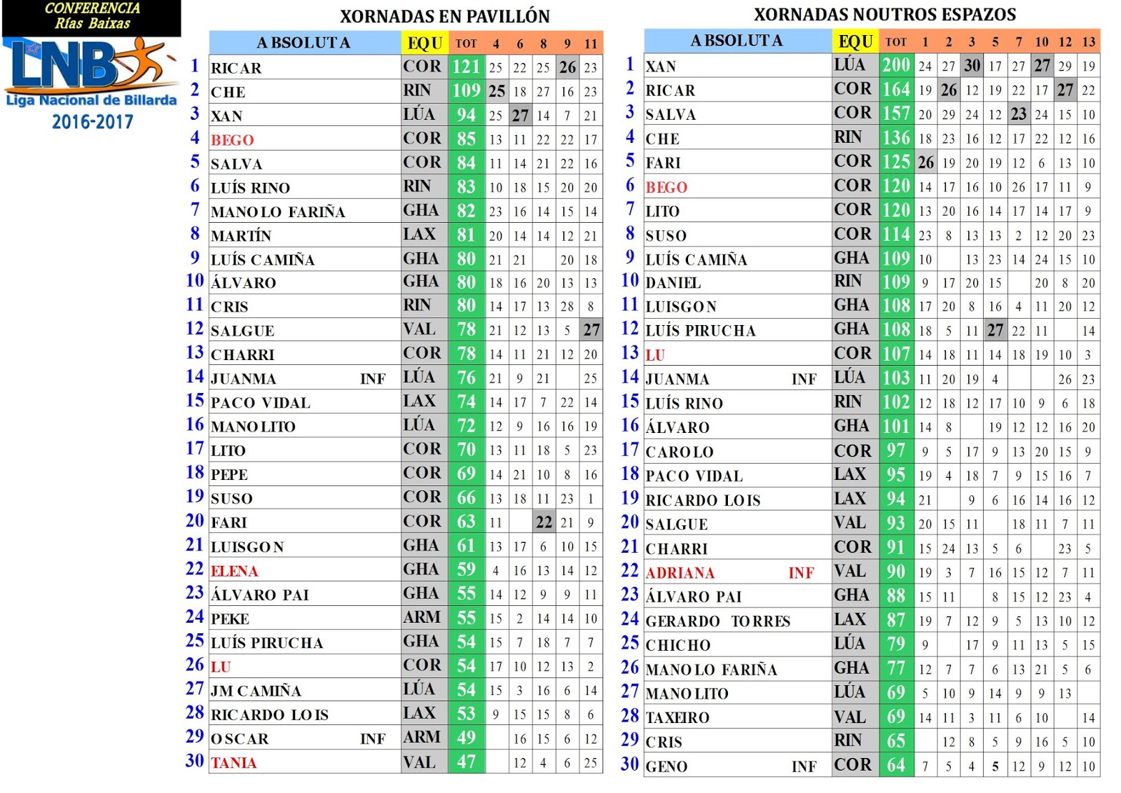 A primeira corresponderíase ás xornadas disputadas en pavillón e a segunda ás xornadas celebradas noutros tipos de superficie. Podemos ver como hai algúns cambios significativos. Que cada quen vexa o seu rendemento de puntos segundo a superficie de xogo utilizada.
