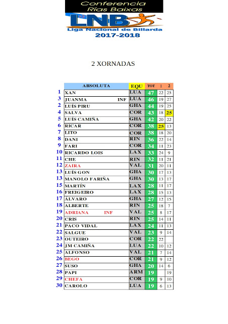 O gran triunfador da xornada foi SALVA, que rematou a xornada cun extratosférico varado (campo olímpico de 50 m x 20 m). Mais tivo que ser no desempate da final contra Juanma, o palanador en idade infantil que estivo a piques de facerse coa súa segunda vitoria absoluta en xornada de liga. O de Lúa de Forza sitúase na segunda praza da xeral, a tan só un punto do líder. Outro que está de volta da longa travesía do deserto é o Piru. O billardeiro da Torre recupera o seu xogo e as súas posibilidades de estar loitando de novo por estar entre os grandes da categoría. Quedou en terceira posición e prometeu buscar, este ano si, algún título de regularidade na súa Conferencia xenealóxica.