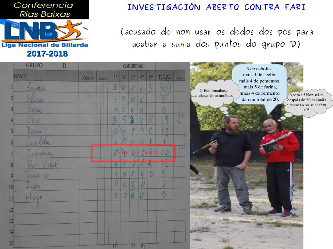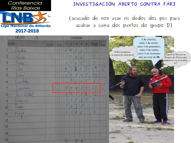 Na xornada de Moscoos houbo varias circunstancias que convén reseñar e deixar por escrito para que todas e todos poidamos xulgar. En definitiva e resumindo, por deferencia de Rinoceronte, nesta xornada houbo premio para o equipo con máis puntos. Pois ben, sumando os puntos das actas aparecía Corredoiras con 81 ptos, Lúa de Forza con 80 e Gharaboto con 79. Segundo as matemáticas, a "empanada de bacallau" iría para o equipo de Bueu. Mais, unha vez chegadas as actas á sede da delegación LNB Rías Baixas, o programa informático de revisión de actas descubre un erro na suma das puntuacións de Juanma, Lúa de Forza, grupo D. Despois de investigacións profundas descubriuse todo o asunto. Hai varias reclamacións presentadas ante o comité de disciplina da LNB. Está estudando o asunto e ao final desta semana tomará unha decisión, despois de escoitar aos implicados. De momento, Fari (xuíz que sumou as puntuacións) e Corredoiras están ás portas da neveira LNB.