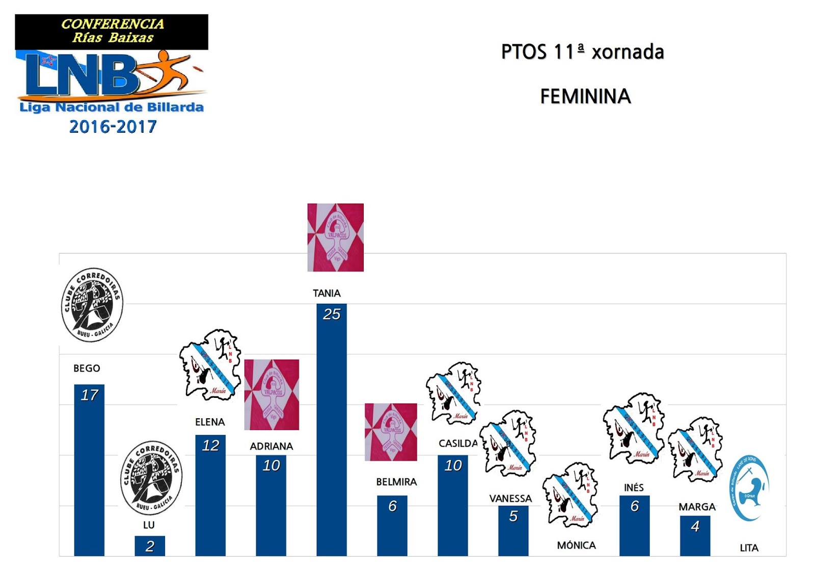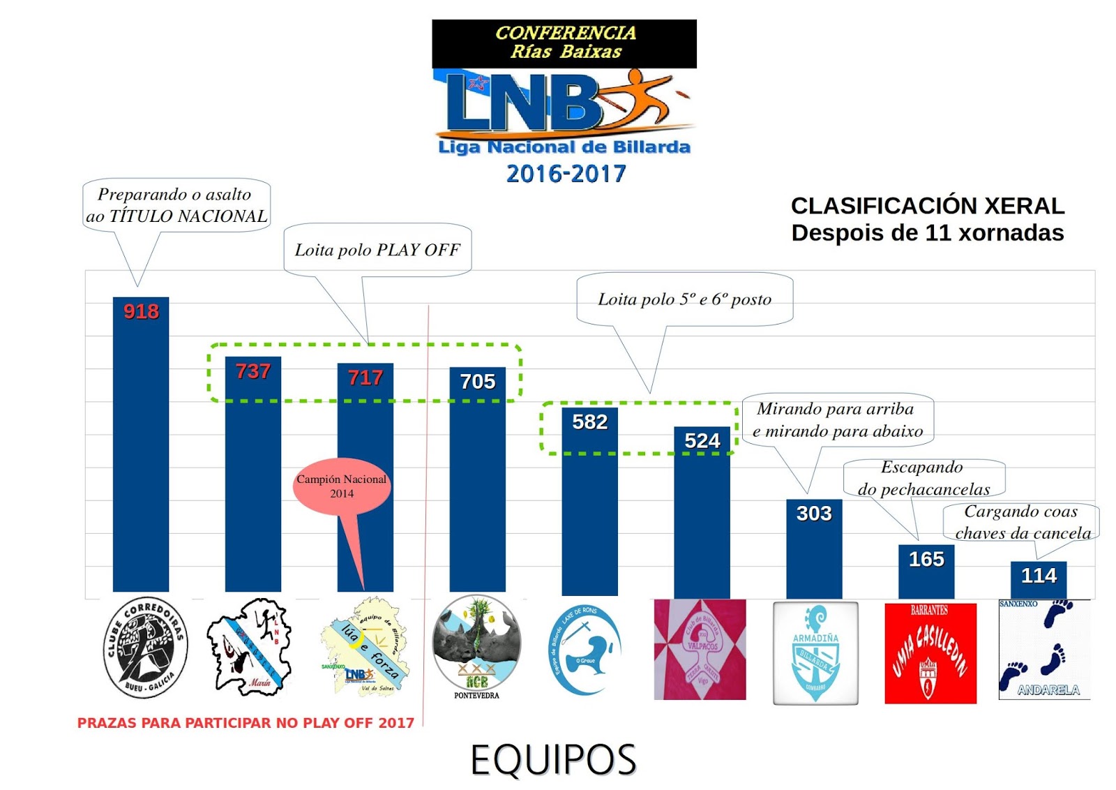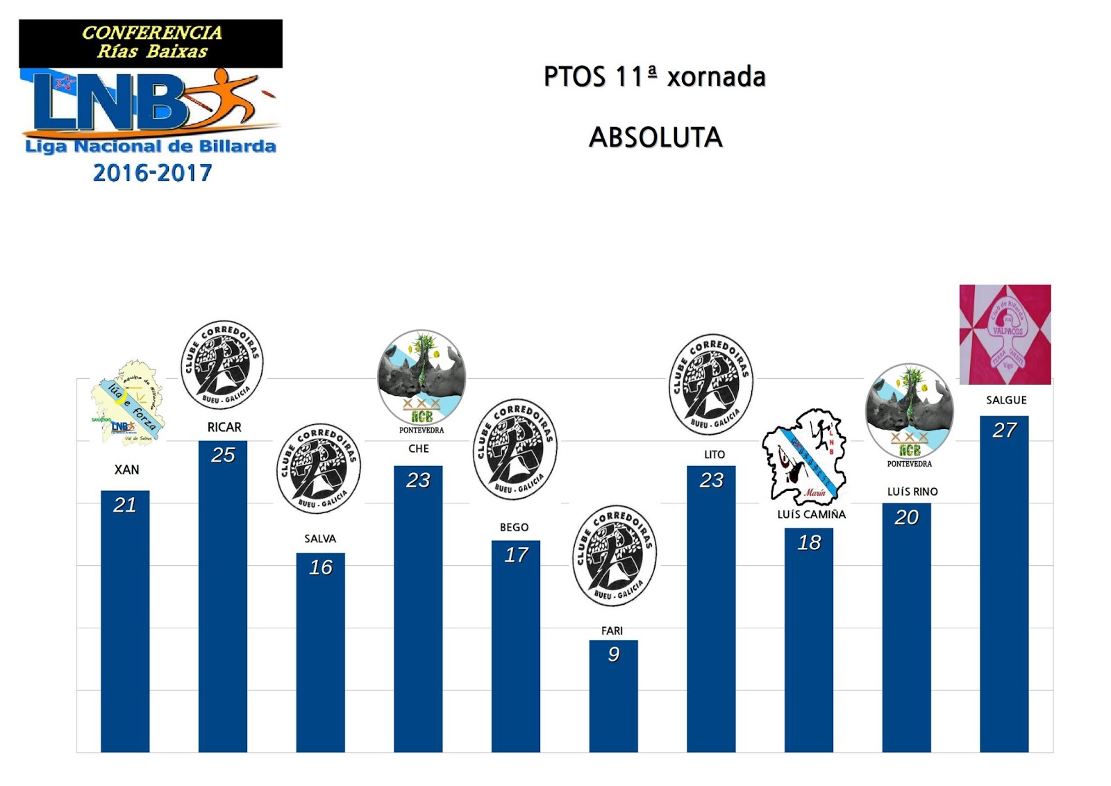 Despois de sumar os puntos desta xornada 11 e faltando 5 xornadas, os xogadores e xogadoras xa están facendo contas para ver se conseguen os seus obxectivos. Para unhas poucas persoas o obxectivo é o título de Conferencia, para outras moitas conseguir estar entre as prazas que dan dereito a participar no PLAY OFF NACIONAL LNB 2017. Entón, todo fai indicar que o Título de Conferencia irá para un destes catro palanadores: Xan, Ricar, Che ou Salva.
