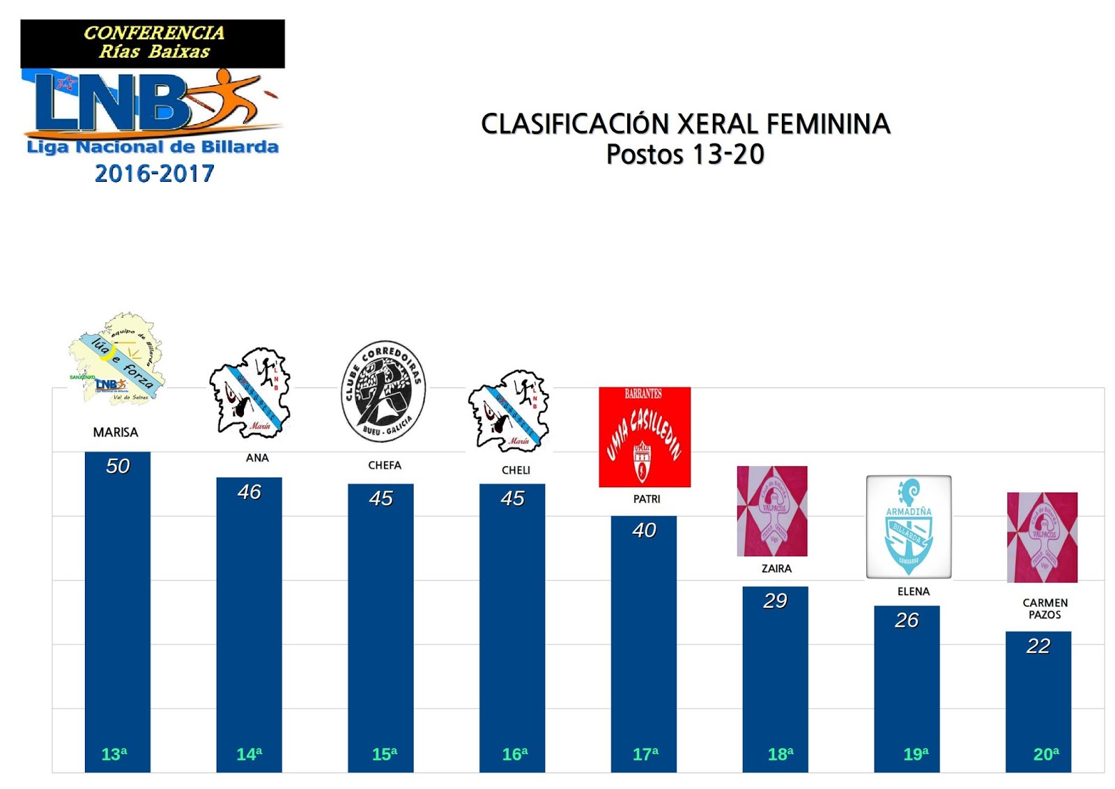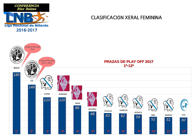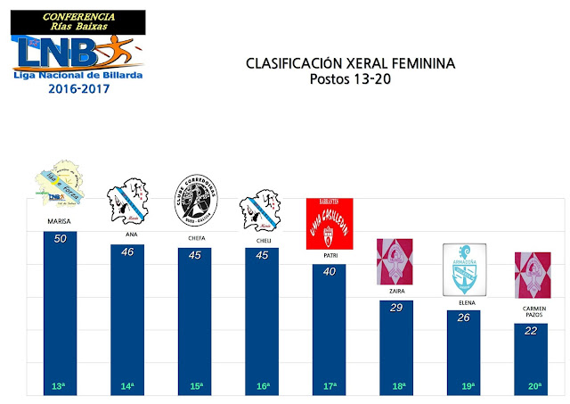 Ademais, as que veñen por detrás aceleran a marcha. Así, Patri, no posto 17, está a 10 puntos dos 50, que marcan actualmente a fronteira entre participar no PLAY OFF e quedarse fóra. Daquela, as últimas 5 xornadas decidirán que mulleres visitaran a Comarca de Compostela o 28 de maio coa intención de mostrar que o Xogo da Billarda é e será sempre de xénero feminino.