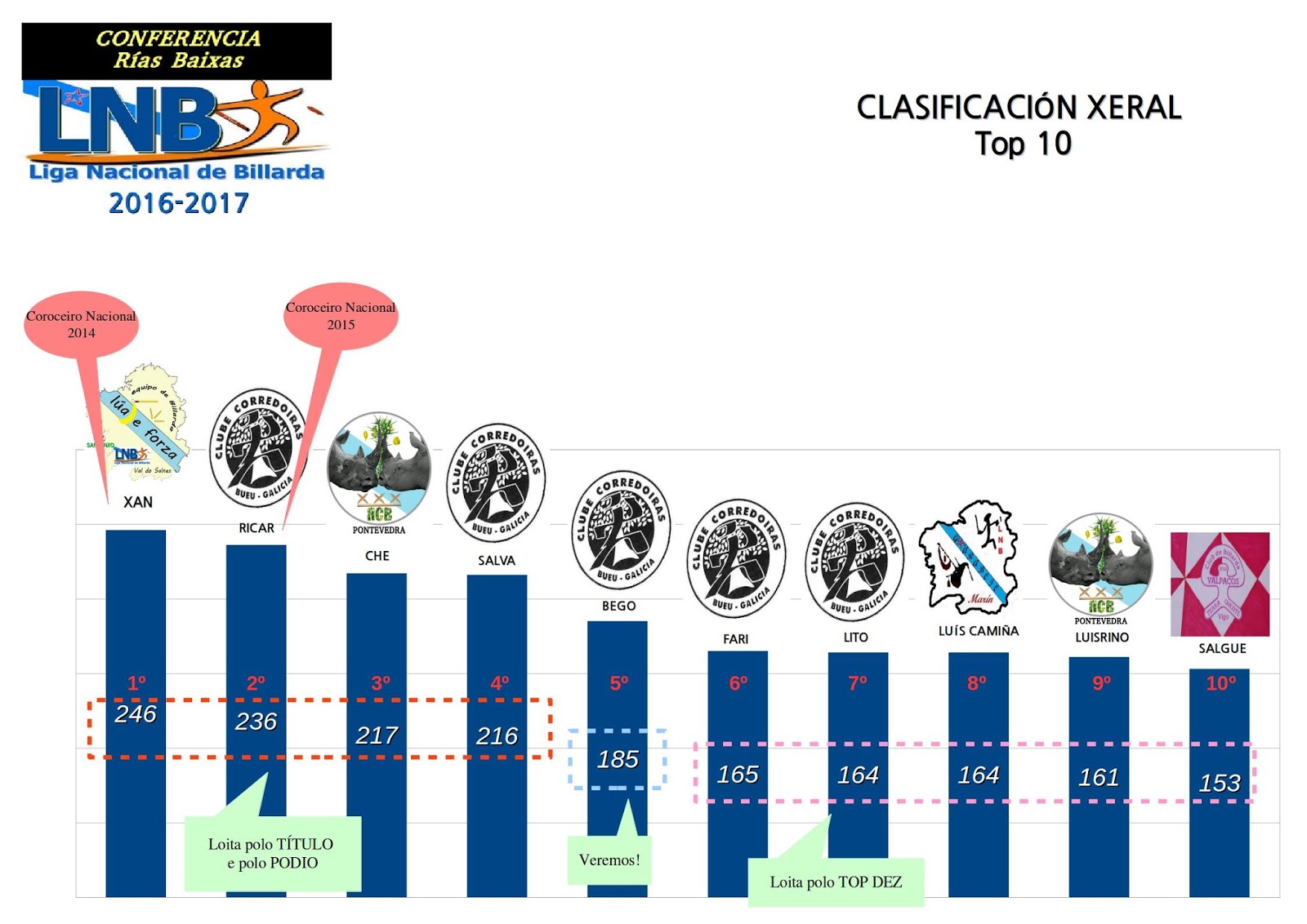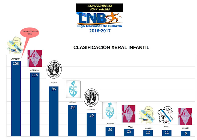 A clasificación mostra que Juanma Camiña, actual Campión Nacional da categoría, vai camiño do seu 3º Título de Conferencia consecutivo, ademais de ser un serio candidato a repetir Campionato Nacional. Adriana continúa sendo un referente feminino na LNB, pois ademais de ter moitas probabilidades de subirse ao podio na súa categoría, tamén está loitando coas palanadoras de categoría senior para entrar no podio adulto. Geno non acudiu a Barrantes e distanciase da segunda posición. Oscar é o palanador debutante de maiores prestacións, xa que empezou a xogar na 5ª xornada e xa está cerca do podio, exactamente a 32 puntos, quizáis demasiados para pensar que poida alcanzar esta temporada as prazas de honor. Mais, dada a súa idade, 9 anos, é o futuro da categoría, xunto con Martiño, pois Geno pasa de categoría este ano e a Juanma e a Adriana quedaralles a seguinte temporada para cumprir idade. Entre estes nenos e nenas estará un ou unha futur@ Coroceir@ Nacional?