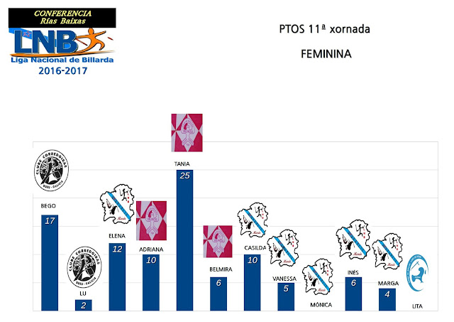 A triunfadora na Categoría Feminina foi Tania de Valpaços Terra Quente, que obtivo unha puntuación de 25 puntos. Unha marca excepcional! Con dicir que este número de puntos só foi superada, durante as 11 xornadas disputadas, por 8 palanadores e 1 palanadora, queda destacada a fazaña conseguida pola xogadora de Vigo. Despois de sumar os puntos desta xornada a clasificación xeral segue encabezada por Bego e Lu é segunda, xa a moita distancia como para pensar que ten poucas probabilidades de alcanzar o título. Onde realmente vai haber emoción é para a última praza de podio, xa que Elena empata a puntos con Adriana (está diante dela por ter puntuación máis alta nunha xornada). Tania afianza a cuarta posición. E do quinto lugar para abaixo haberá loita por conseguir praza de PLAY OFF, pois entre Belmira que ocupa este quinto posto e Marisa, que é a primeira que se quedaría fóra, non hai máis ca 18 puntos. Entre elas están cinco palanadoras de Gharaboto, Casilda, Vanessa, Mónica, Inés e Marga, nesta orde.