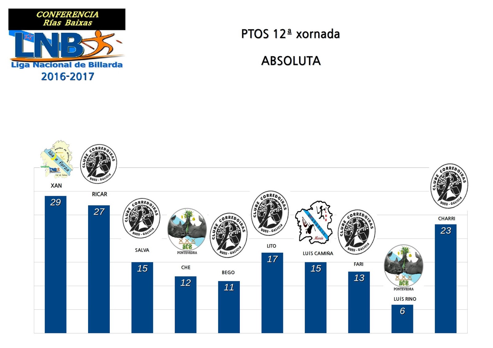 LAXE DE RONS e ARMADIÑA superaron os 40 puntos e seguen nunha boa liña de actuacións. VALPAÇOS TERRA QUENTE estivo algo por debaixo das súas prestacións. Acaso a ausencia de Taxeiro (está de baixa e aproveitou para facer de asesor técnico) tivo un efecto negativo no rendemento de xogadoras e xogadores?, ou sería que as súas instrucións desde a banda non foron as adecuadas? CASELLEDÍN presentou a 5 competidores cousa que non sucedía desde comezos de temporada e notouse, pois estivo cerca de conseguir 20 puntos. ANDARELA non chegou aos 10 puntos con 3 xogadores.