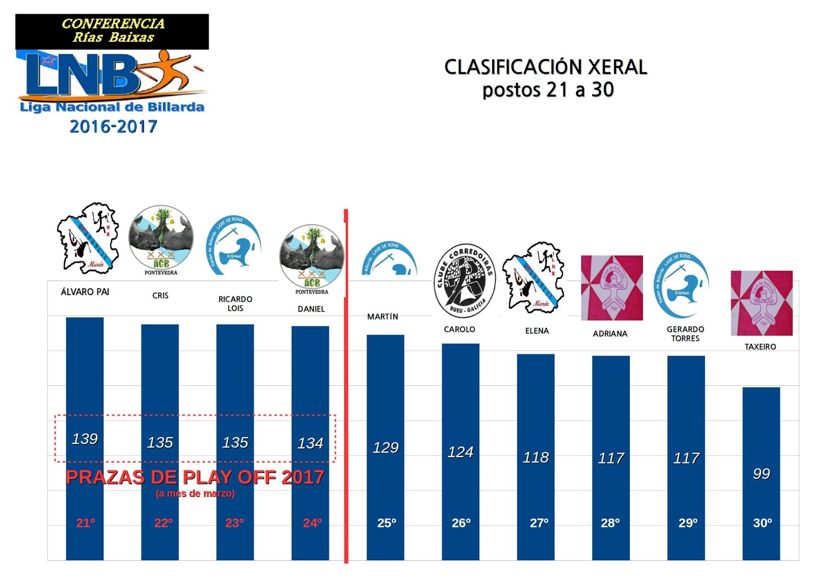 As previsións meteorolóxicas durante a semana previa indicaban a tendencia de tempo chuvioso, mais o sábado as nubes que sobrevoaron Mourente non se atreveron a deixar caer auga sobre o terreo terruño-herboso do campo de billarda. Daquela, todo parecía prever que o equipo RINOCERONTE tería unha boa ocasión para acceder á terceira posición do podio. Hai veces que a nosa imaxinación non é quen de deseñar o futuro. Deste xeito, o equipo de Pontevedra levou un batacazo importante, xa que só conseguiu 40 puntos. Ademais, coincidiu coa boa actuación dos equipos que están diante na clasificación. Tanto GHARABOTO como LÚA DE FORZA, superaron os 70 puntos e xa se distancian demasiado, quizáis. Os outros equipos estiveron nos seus números. CORREDOIRAS dominou de novo a xornada. O equipo de Bueu non ten outro obxectivo que chegar no mellor momento de forma ao PLAY OFF 2017 para conseguir un título que se lle escapou o ano pasado por un punto.