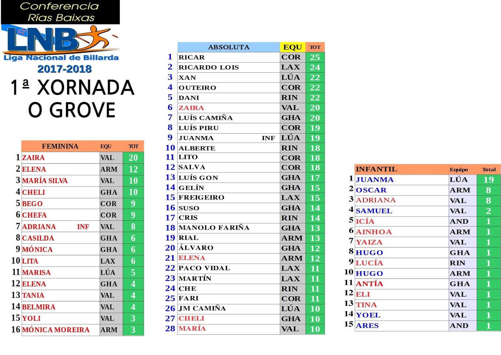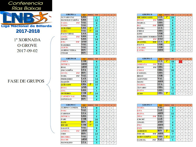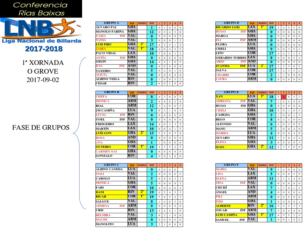 Aquí temos as aliñacións dos equipos na primeira xornada do Grove. De novo, o actual estrela azul da LNB (CAMPIÓN NACIONAL 2017) conseguiu sumar máis puntos que os demais equipos. Pero, vemos que Gharaboto non quedou moi lonxe, o que nos fai pensar que este ano si haberá máis igualdade, ou iso parece. Ademais, esta temporada o equipo de Marín ten o cadro de xogadores máis numeroso da Conferencia. Nesta xornada presentou 18 xogadores/as. Só Armadiña e Valpaços teñen orzamento para confeccionar un equipo a ese nivel cuantitativo. Certamente, non sempre se corresponde unha alta puntuación cun número elevado de competidores, mais o normal é que sexa así. Nesta xornada, Corredoiras competiu só con 8 xogadores e conseguiu máis puntos que ningún outro equipo, pero este caso é excepcional, xa que dos 8 xogadores hai 1 coroceiro nacional, e dúas campioas nacionais, ao mesmo tempo que 5 destes xogadores quedaron no Top Dez de Conferencia da temporada pasada.