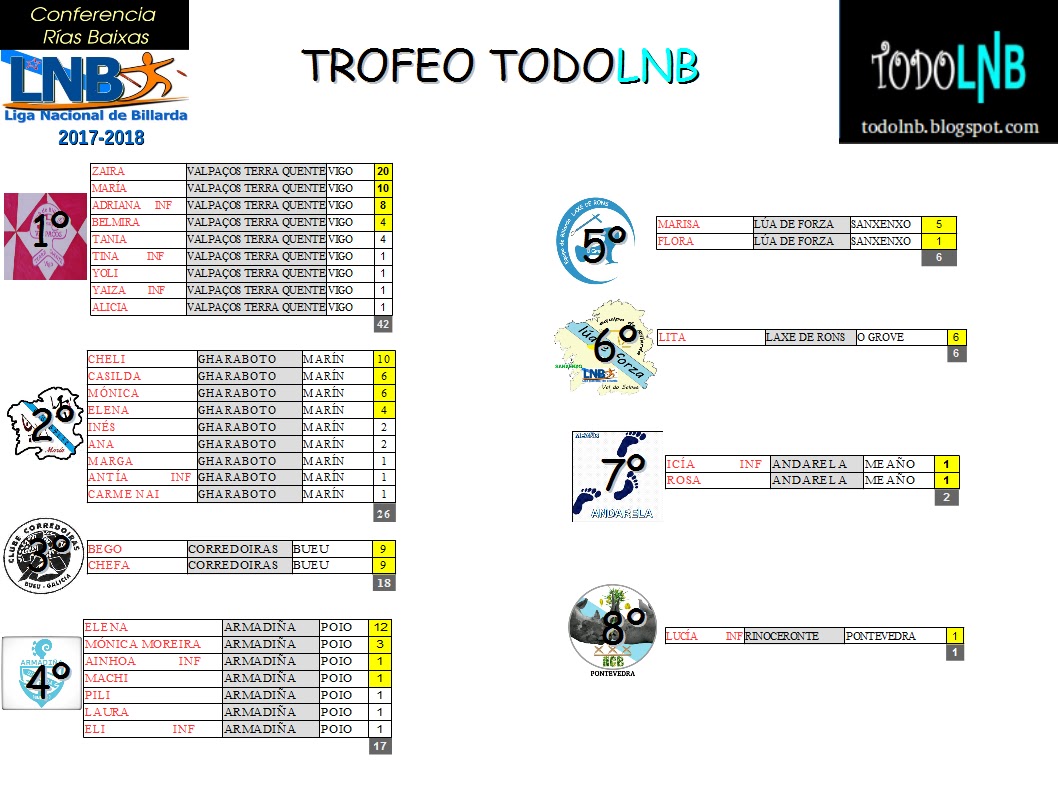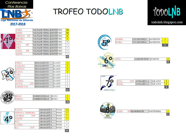 Haberá unha nova Categoría nas clasificacións de Conferencia que será a de Equipos Femininos e que terá os seus trofeos finais de Conferencia (Trofeo TODOLNB). Sumaranse as 4 mellores puntuacións femininas de cada equipo. O obxectivo é fomentar a participación de nenas, mozas e mulleres. Así que, a buscar talentos! Pódense poñer anuncios solicitando palanadoras para equipo de billarda!