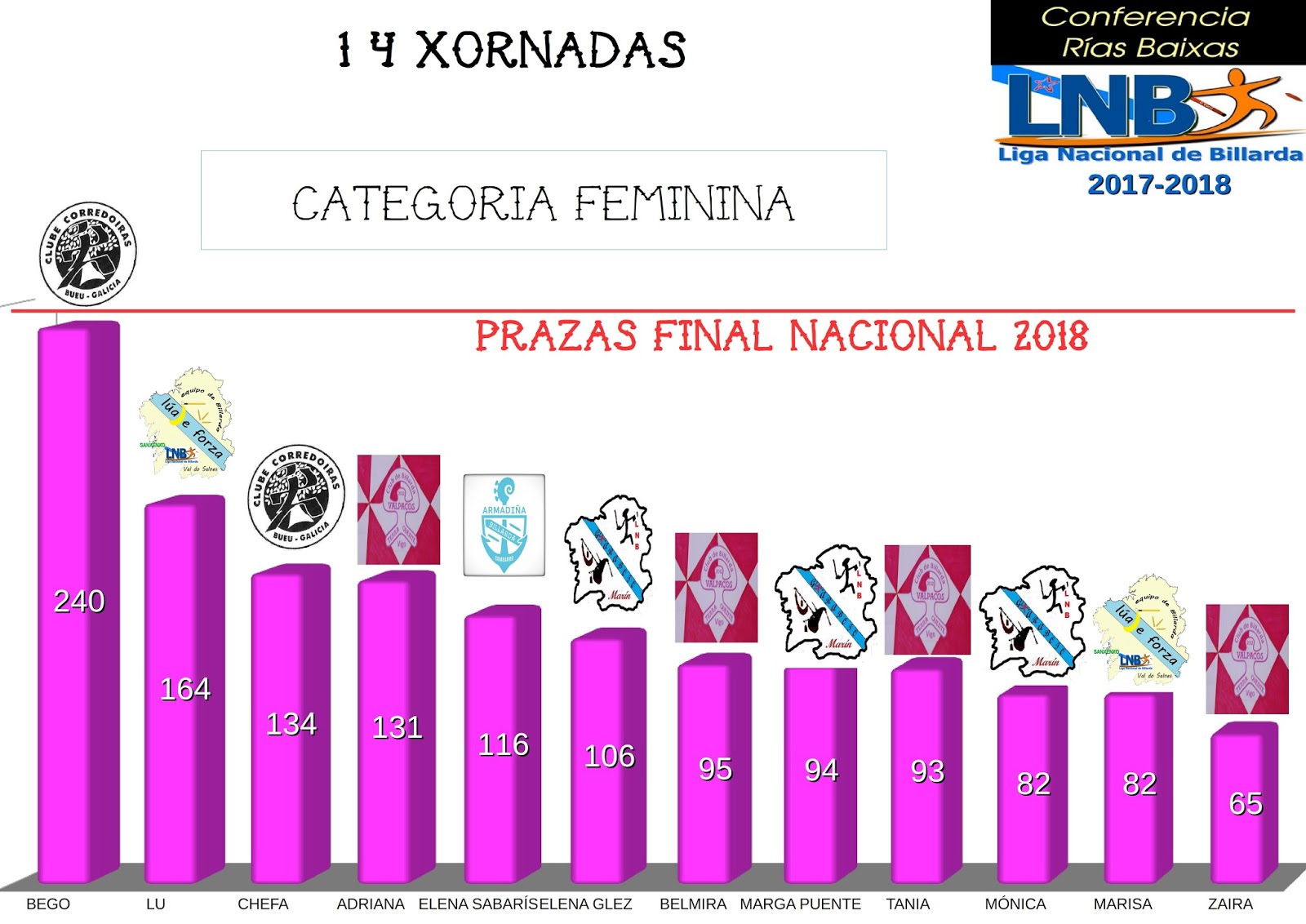 A xornada de Vilaboa, do pasado sábado 27 xaneiro, confirmou que a participación feminina é a máis elevada da historia da LNB. Nunca antes se estivera en números de 30 mulleres de media por xornada. Nunca antes houbera unha participación de 38 mulleres nunha xornada. Todo indica que o morado é a cor de moda. A participación das últimas catro xornadas estivo por enriba da media (82). Poderase esta temporada establecer unha marca absoluta de participación? Será moi complicado, pois superar a presenza de 108 persoas (Conferencia Sur, Porriño, 2009) non é doado.