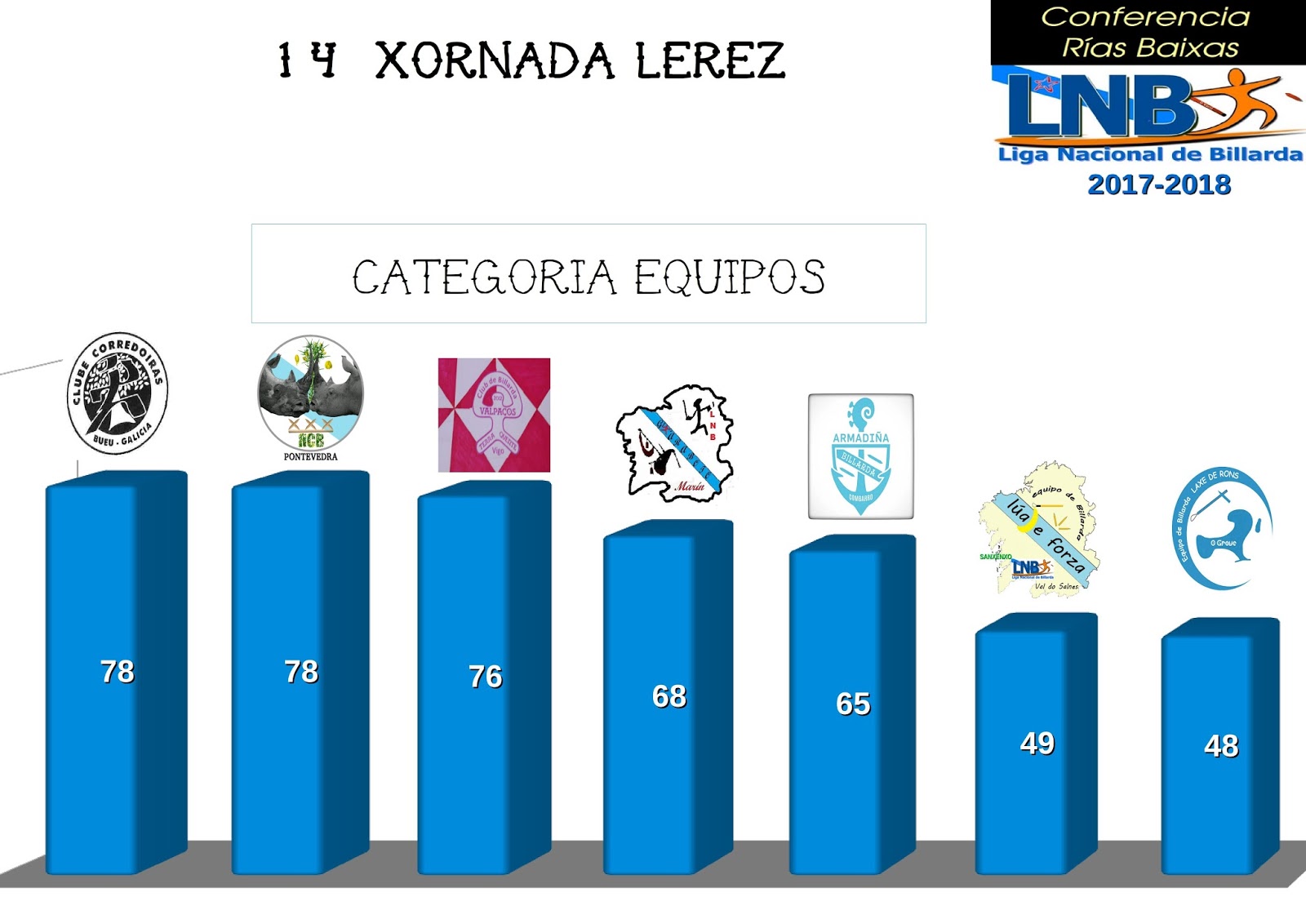 Comeza a Temporada 2018-2019 na Conferencia Rías Baixas, a oitava desta Conferencia, que naceu o 2 de outubro de 2011. Por favor, consultade os documentos do Regulamento, Medidas, Sistema de Competición e Sistema de Puntuación. Hai uns pequenos cambios con relación aos documentos do ano pasado. O máis significativo é o cambio nos Sistemas de Competición e de Puntuación. Así, na primeira fase de grupos continúa igual que a temporada pasada. Na seguinte fase de cruces eliminatorios é onde houbo cambios. Do mesmo xeito, modifícase a puntuación d@ ganador/a da xornada, agora levará 6 ptos, que se lle sumarán aos conseguidos na fase de grupos.