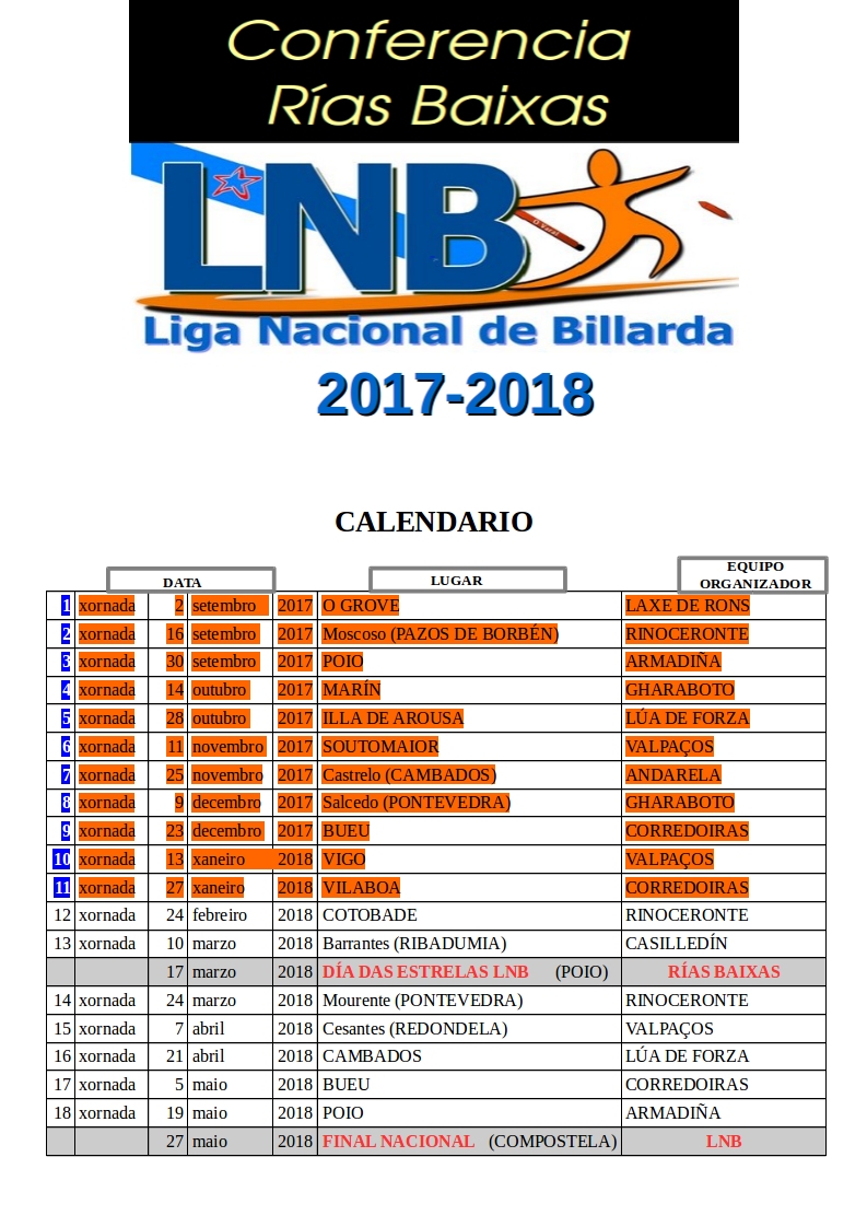 Por outra beira, xa temos as primeiras informacións sobre o Día das Estrelas LNB 2018 que este ano será organizado pola Conferencia Rías Baixas. Tivemos acceso ao deseño dos trofeos que se poñerán en xogo. Tanto pola mañá nos concursos, como pola tarde no Aberto das Estrelas, entregaranse uns magníficos trofeos artesanais valorados en perto de 500 euros. Despois de varios meses de traballo en dous talleres artesanais, un da provincia de Pontevedra e outro da provincia da Coruña, os froitos empezan a agromar. Chegáronnos as primeiras fotografías do proceso de elaboración. Ademais, quen gane o Aberto obterá praza directa para a Final LNB do 27 de maio en Compostela. Motivos suficientes para acercarse a Poio, ao Estadio Nacional de Billarda da Seca, o 17 de marzo. Todo comezará ás 12 h., segundo nos comunica o equipo local, Armadiña.