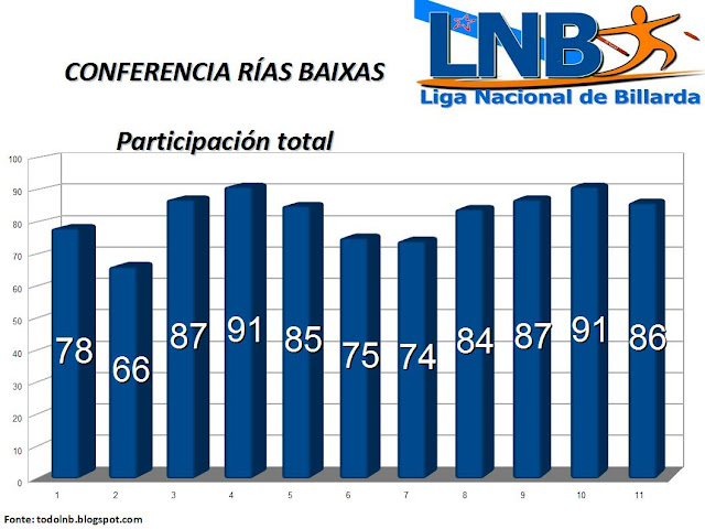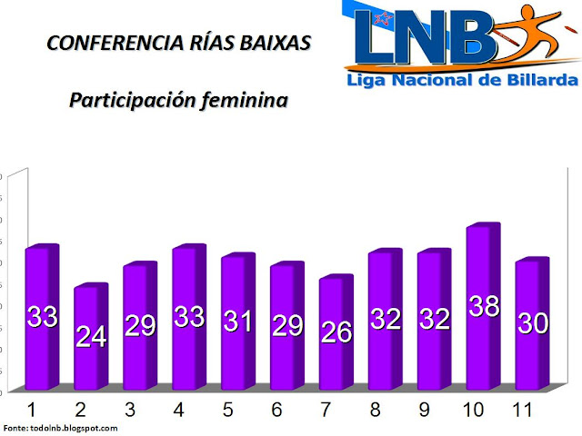 A xornada de Vilaboa, do pasado sábado 27 xaneiro, confirmou que a participación feminina é a máis elevada da historia da LNB. Nunca antes se estivera en números de 30 mulleres de media por xornada. Nunca antes houbera unha participación de 38 mulleres nunha xornada. Todo indica que o morado é a cor de moda. A participación das últimas catro xornadas estivo por enriba da media (82). Poderase esta temporada establecer unha marca absoluta de participación? Será moi complicado, pois superar a presenza de 108 persoas (Conferencia Sur, Porriño, 2009) non é doado.